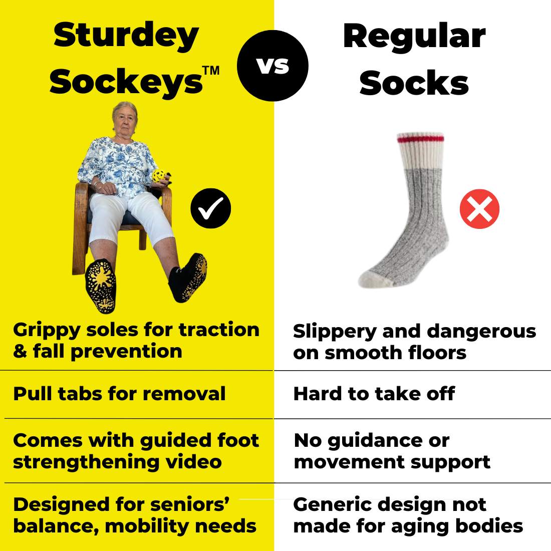 Regular socks can be slippery, tight, and unsupportive. Sockeys are made specifically for seniors, with non-slip soles, and a foot strengthening video to help you move safely and confidently..