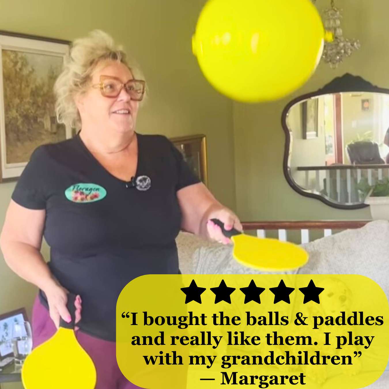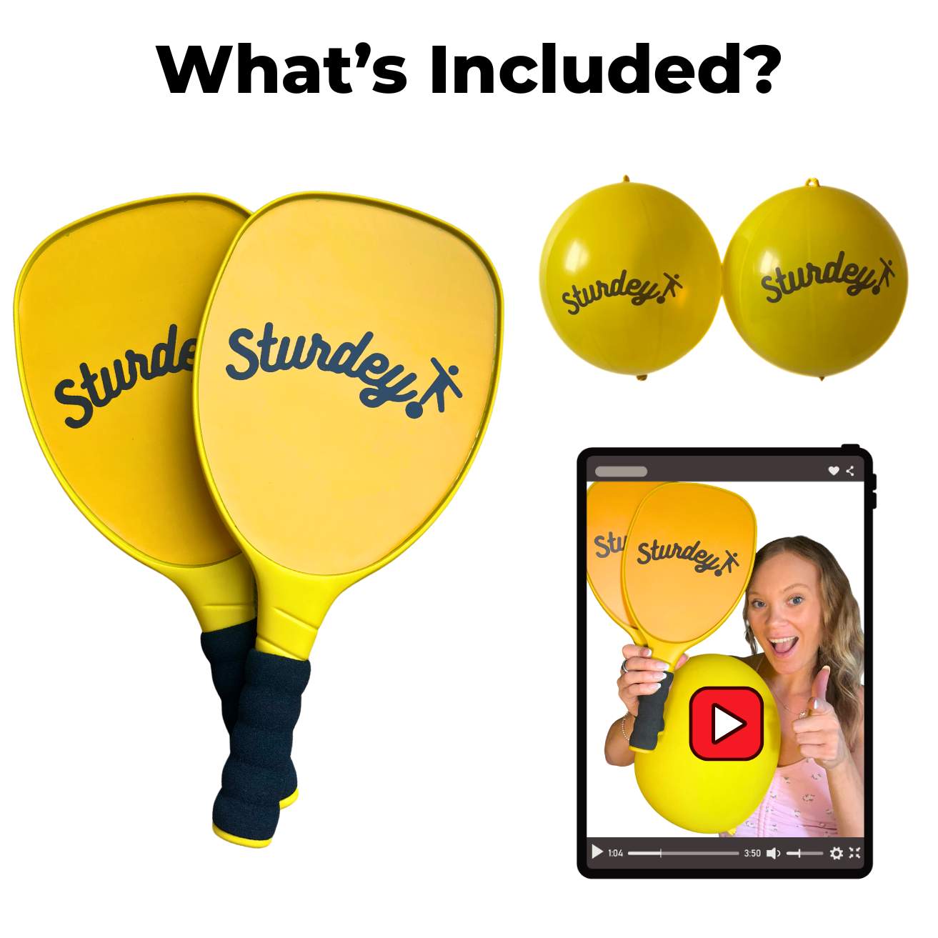 Each set comes with 2 paddles, 2 soft balloon-style balls (Volleys), and access to a guided exercise video!