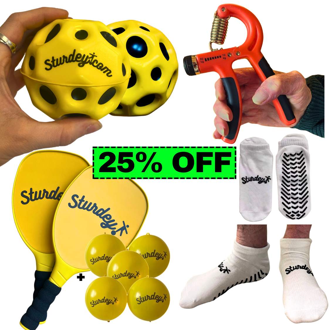 The Best Deal Bundle is designed to target all the key areas involved in fall prevention. The Sockeys keep your feet steady with their non-slip grip, reducing slips and giving you more confidence when moving around your home. The Volley balloons and Strikeyball set train your balance, coordination, and brain agility in fun, engaging ways that keep your reflexes sharp. The Grippey hand gripper builds grip strength, which is crucial for safely holding onto railings, walkers, or support surfaces.